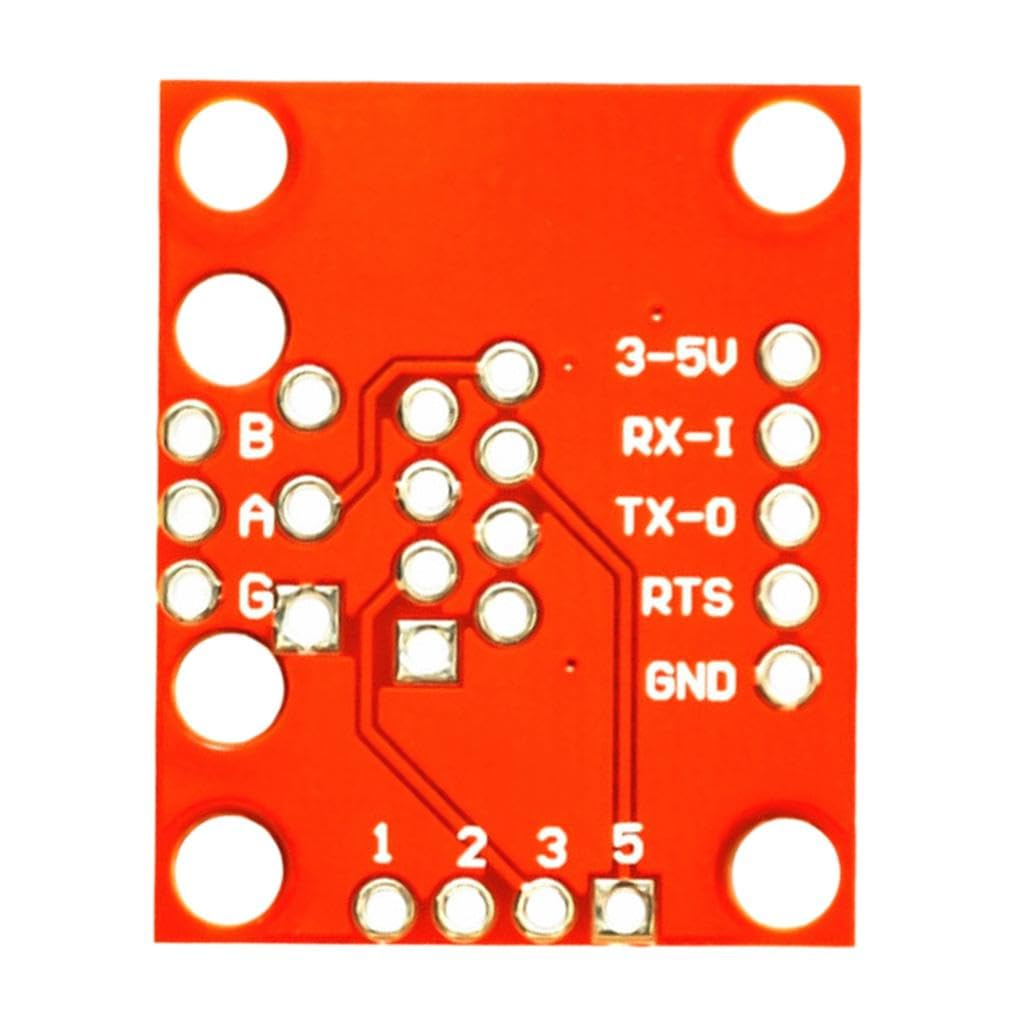 The pins relevant for the connection with the Wemos D1 Mini are labelled other side of the board. 3-5V and GND are for the power supply. These can be connected to 3V3 and G. RX-I and TX-0 are for receiving and transmitting data. Since the SP3485 is a half-duplex transceiver that can only communicate in one direction at a time, the RTS pin allows for switching between receiving and transmitting.