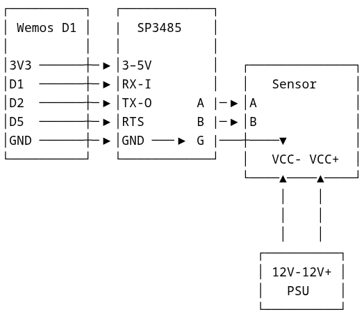 All grounds are linked. Note the connection between the Wemos D1 ground, both grounds on the SP3485 as well as the sensor ground (VCC-).